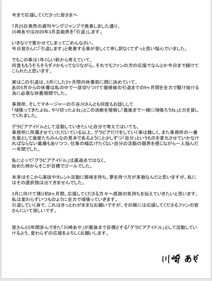 2016年にはミスFLASH2016でグランプリを受賞し、トレードマークの“くびれ”と超急角度のハイレグで人気を集める川崎は、「週刊ヤングジャンプ」34号(7月25日発売)の表紙&巻頭&センターグラビアに登場し、同号で「芸能界引退発表」をした。
