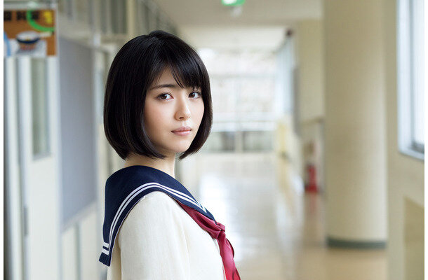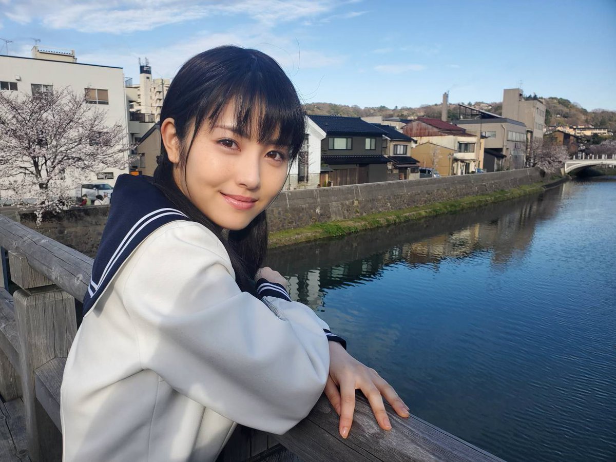 黒髪を二つ結びにしたセーラー服姿の浜辺さんを、桜並木が続く川岸をバックに収めていて、浜辺さんの透明感が際立つ写真になっている。