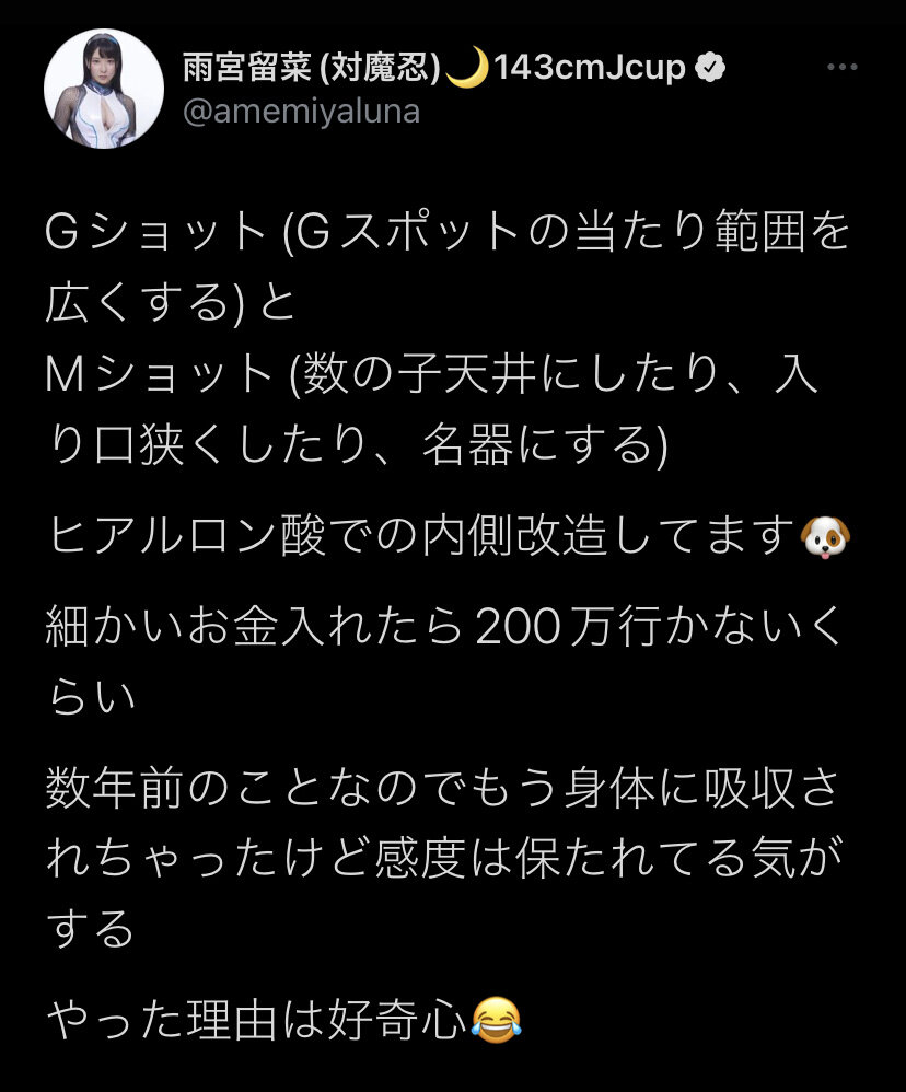 雨宮は「リアルTENGAになりたく女性器にヒアルロン酸を道が狭くなるように打って壁構築。