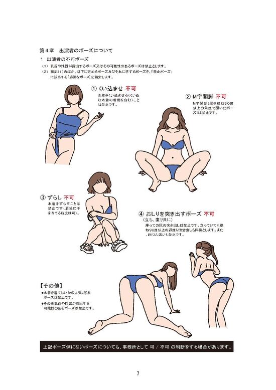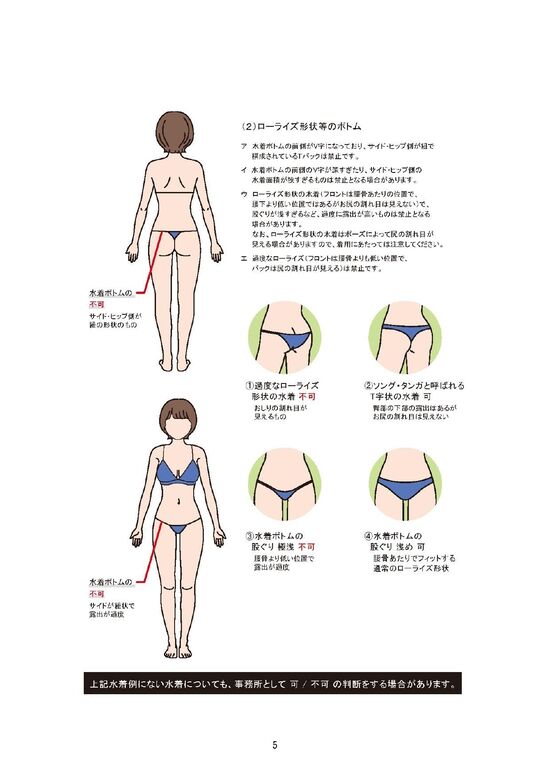 禁止ポーズの「尻の突き出し」や「四つんばい」「M字開脚」なども図示した。パンツは「お尻の割れ目が見える」のは禁止だが、臀部(でんぶ)が大きく露出する「Tバック」はOK。ネットでは「これはOK」などと面白がるように水着写真を掲載する人々も現れた。