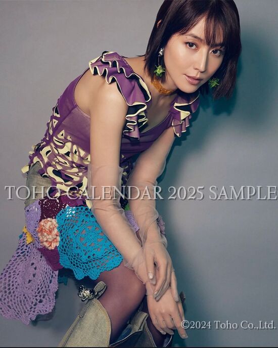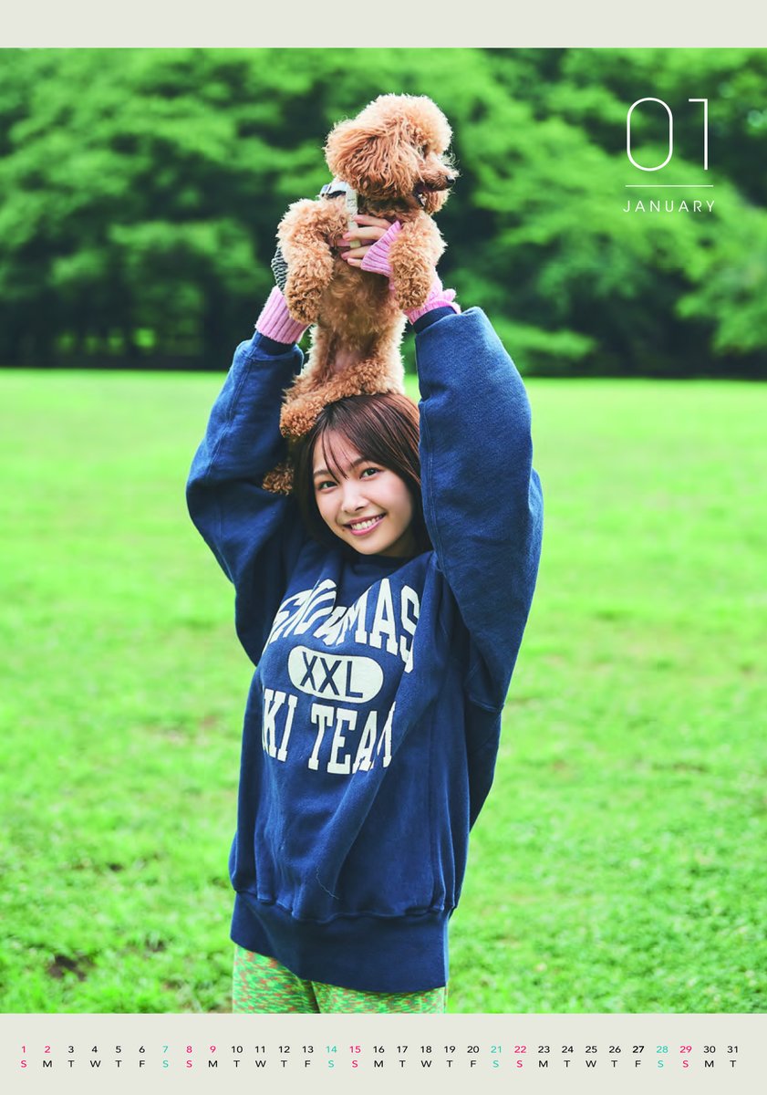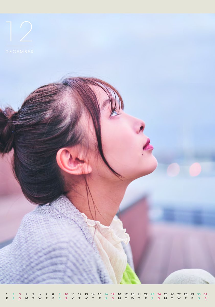 「私の初めての4月始まり卓上カレンダーが3月7日(土)に発売致します」と報告し、胸元や腰のくびれ部分が大胆に露出された衝撃的デザインの花柄水着表紙カットや、赤のトップスにオフホワイトのスカートをまくりあげて脚線美を披露した12月のカットを公開した。