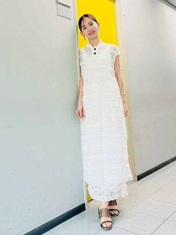 髪をひとつに束ね、白いニットワンピースにアクセサリーをプラスした洗練されたスタイルの最新ショットを公開したのは、元「YURIMARI」で活躍した女優の中村ゆり。デコルテラインの透け感が目をひくトップスを美しく着こなしている。